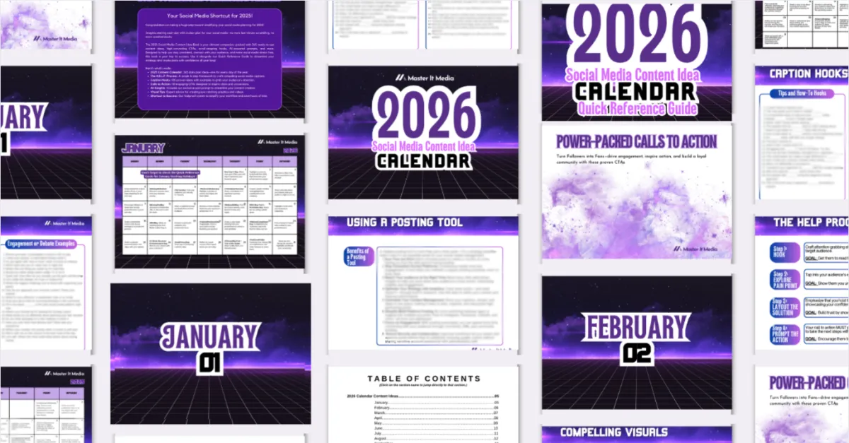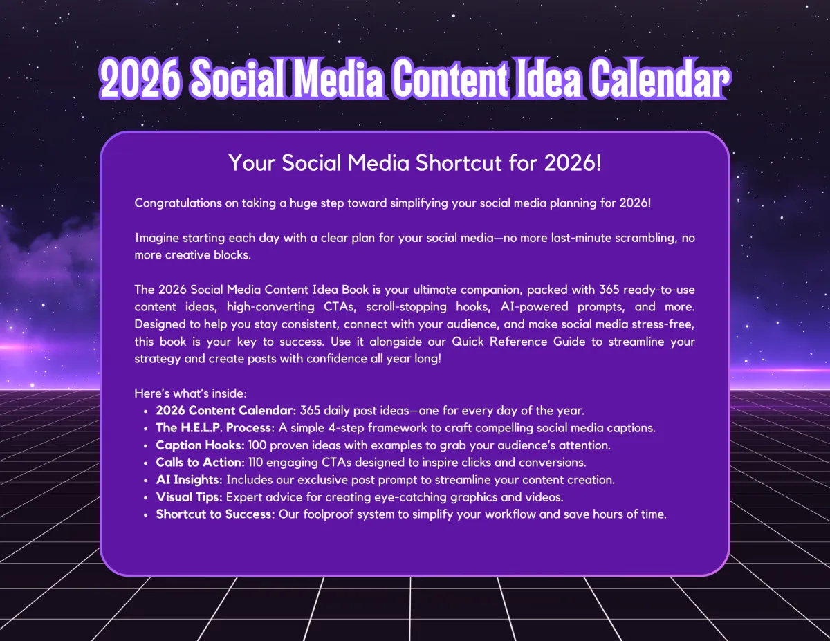The 2026 Social Media Content Idea Calendar is your go-to resource for effortless posting, featuring 365 ready-to-use content ideas, scroll-stopping hooks, AI-powered prompts, and high-converting CTAs. Whether you're a busy entrepreneur, a creator, or a social media manager, this book is designed to save you time, reduce stress, and help you show up consistently. Plus receive our Quick Reference Guide with more ideas and tips!